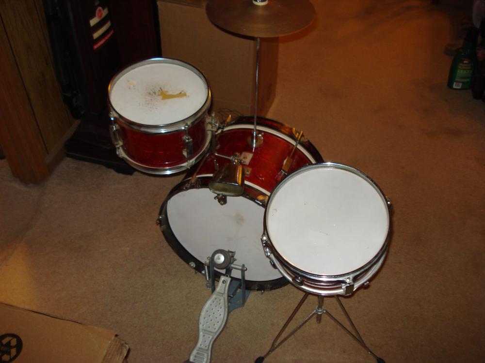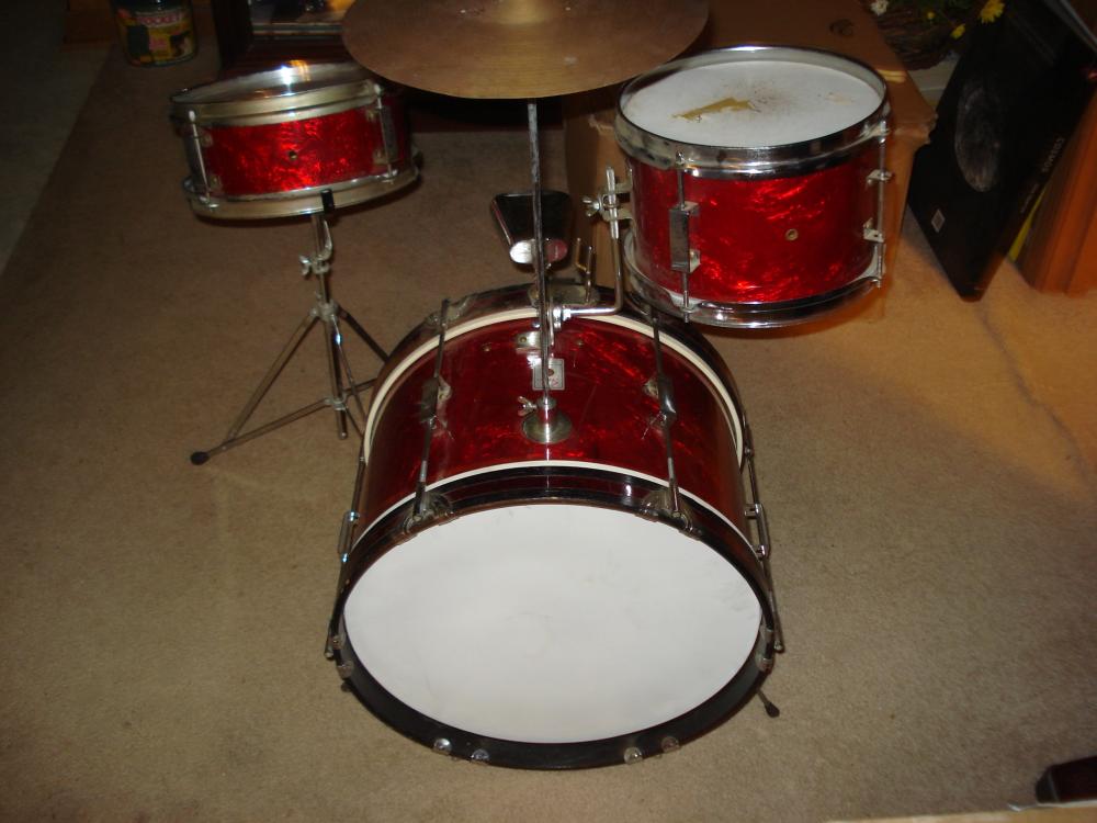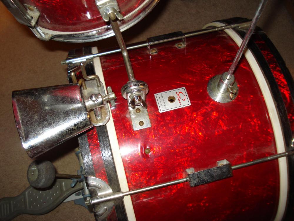 I just bought a vintage Star Drums childs set and can not find any info on them anywhere. I have a standard size Star Drums kit so I know alot about them. I can find no pictures nor even a mention in any Star catologs I have or have seen. These are from 1965-1968 because of the Badge style. The kit has wood shells and standard metal rims and hardware all but the lugs. Most of the hardware matches the regular hardware except a few items that are smaller in size. The kit has a 10 x16 kick with wooden hoops...6 x 9 rack tom...and a 4 x 10 snare with knob adjustable internal snares. The kit came with a 10 inch cymbal mounted on a straight rod on top of the kick. It came with a dual hoop mount cowbell woodblock mount with a 4 inch chrome cowbell. Woodblock was missing. It also has a bass drum pedal and even a small adjustable snare stand. The wrap is red oyster pearl. The kit is in great condition and has a few small issues...mostly small holes in the rack and snare heads. I have a few pictures in an album on my page so check them out and tell me what you can, or where to find the info. Thanks! Help2