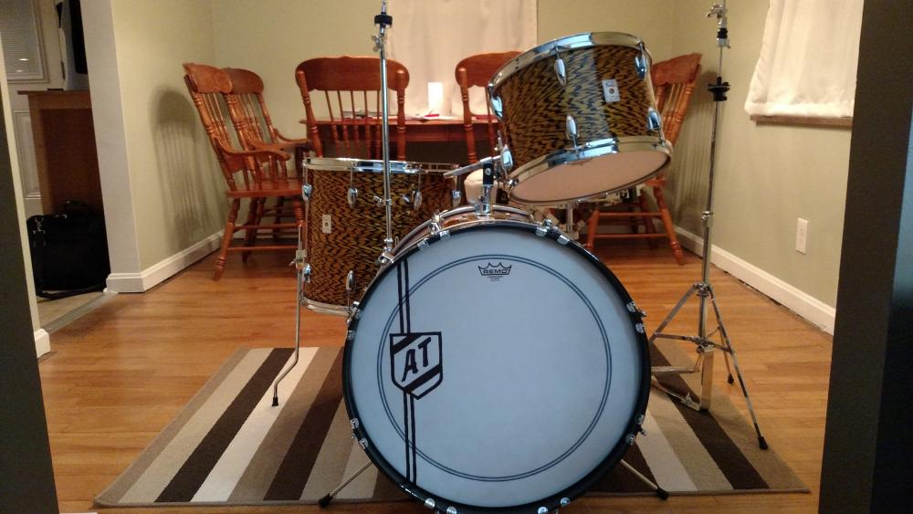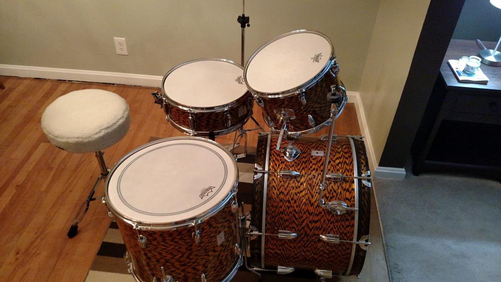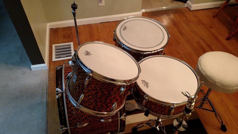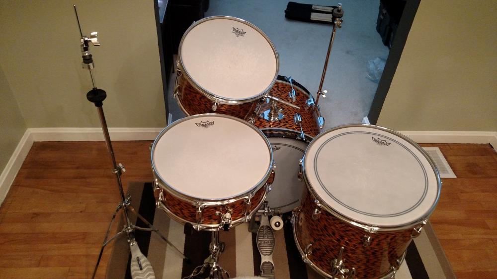 I am using the pedal and hi-hat stand (also all cleaned and shined) that came with the kit. Other than new 2.3mm hoops and heads all around (and a few new screws for mounts), everything is original except: