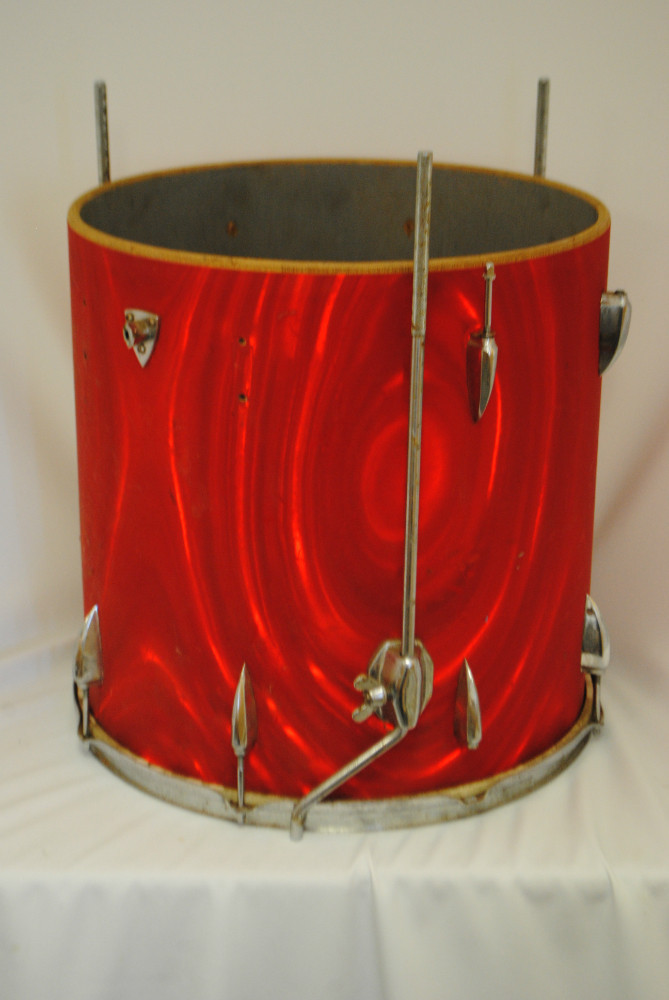 6) The wrap (a red swirl satin) is in mostly very good shape. One minor crack/split on one of the bass drum casings. The kit is filthy but that's no biggie.