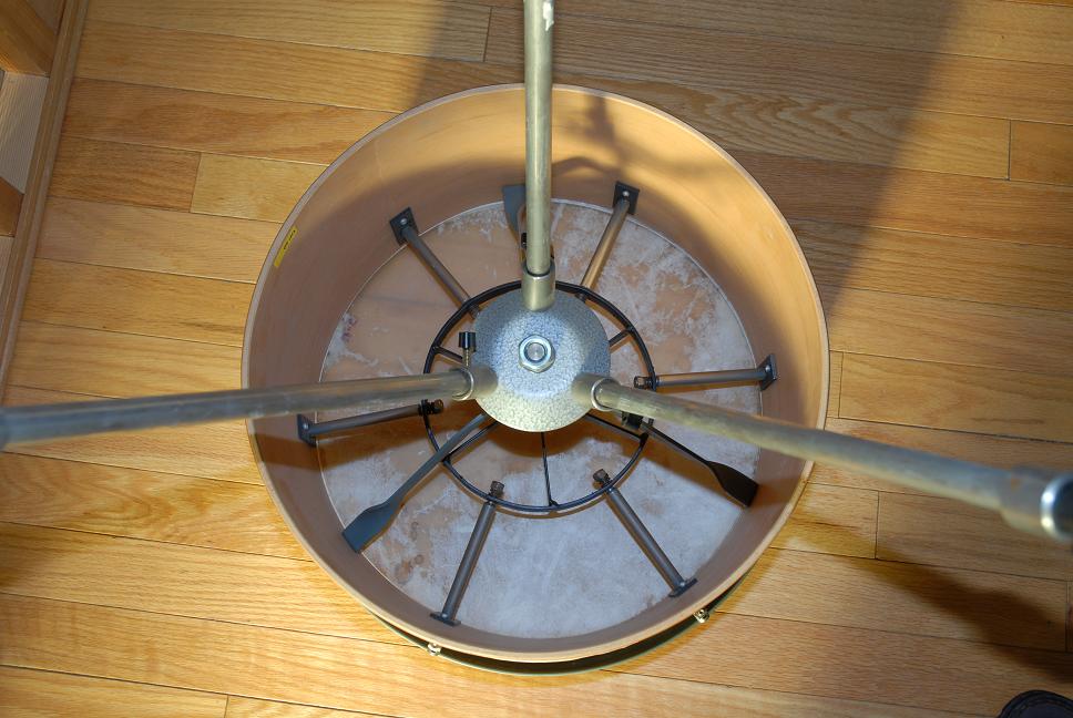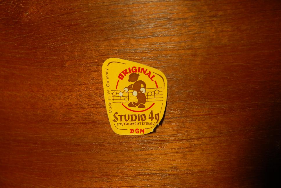 I recently acquired this rotary timpani from a garage sale. According to the seller the drum had been in their family for many years. From what I have learned on their website Studio 49 was founded by Carl Orff in 1949 and is still producing instruments today. Judging by the hexagonal nuts and dark mahogany I believe this drum to be made between 1975 - 1992. Tuning is accomplished simply by turning the drum clockwise to tighten and counter clockwise to loosen. It measures 22.5 cm (8 3/4'') deep and 38.5 cm (15 1/8'') wide.