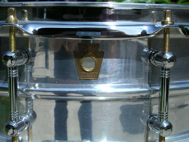 Up for auction is a 14 x 5 mid 60's Ludwig Supra. This baby had been totally tricked out. Most of these have the chrome flaking off and really pitted. I had this one chemically stripped of chrome and then professionally polished out. Since these things are aluminum, they polish out really nice. The badge was reinstalled using the proper crimping tool and a genuine Ludwig vent grommet. It has all new parts including custom tube lugs, P-86 Millennium strainer, new tone control, brass tension rods, new triple flanged hoops and heads. You'll never have to worry about this one pitting or flaking! She has that great vintage Supra sound with the reliability of new parts.