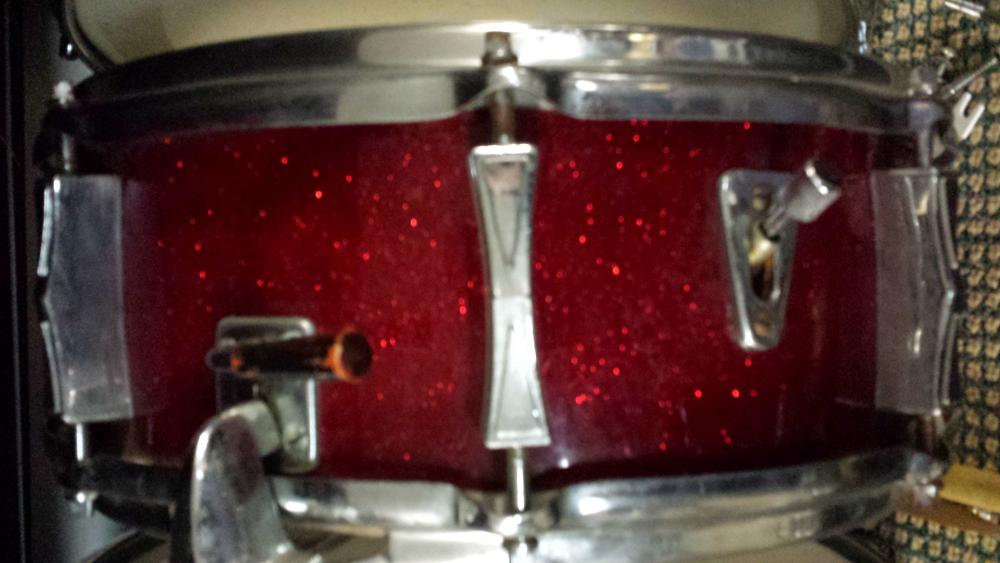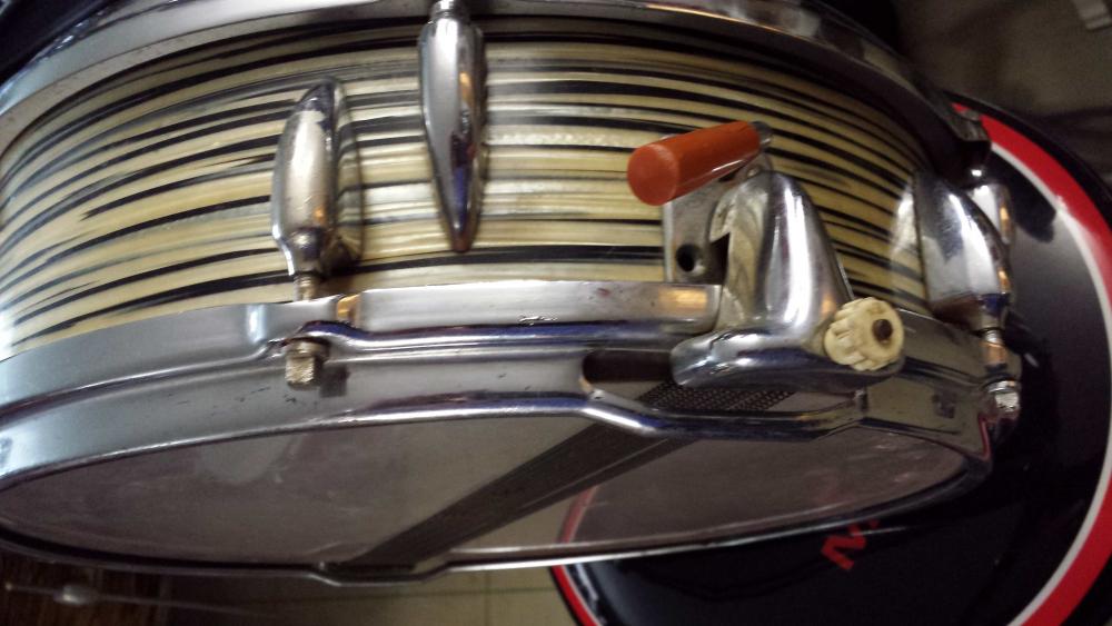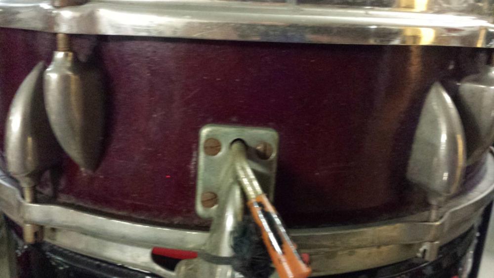 I really like the colour of this P: Both the top and bottom head have no logos so they seem original to me. The finish seems nicely preserved and it is a nice purple if you ask me. The snare mechanism seems to be stuck, or inverted.. shouldn't be such a problem to fix. I don't really know how it sounds yet since I don't have a real Tacton drum key.