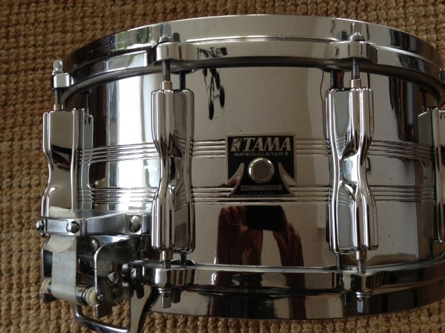 Hi fellas, here's my latest acquisition. A Tama Imperialstar Mastercraft snare 14"*6.5". It's not in impeccable condition for its price, but it's fairly nice. The only complaints I have is that the black plastic thing that's attached to the shell with 3 screws which holds the muffler is cracked and the one touch knob of the muffler has been slightly modified (I think). Even though I don't use the muffler, I think it's still nice to have one that is intact so if anyone has one to spare please let me know. According to catalogs this snare is made from 1981, but I doubt this one is from that year, serial number is 15401963. But who knows.