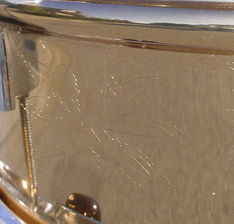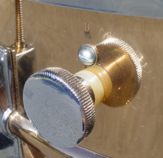 The engraving is the laser-engraved 10 point floral pattern similar to the 1929-only 10 point floral pattern. One interesting thing that I noticed on all three drums (four drums now) was the absence of engraving in the top half of the panel that is left of the butt side SS mechanism. Any ideas why that happened? Any 75th owners out there with the same situation? If you look at the top half of the shell starting at the butt side SS mechanism and move to the right you'll have drilling for the SS mechanism, tone control, Ludwig badge, 75th Anniversary plaque, engraving, lever side SS mechanism, engraving, engraving, engraving and then the blank area. It doesn't seem logical to me why the engraving would be left out in that area. I did hear that these panels were left blank because that's where the 75th Anniversary plaque was originally supposed to be placed; so now I hear all of you enquiring minds asking (in unison) the logical question: "So is there engraving under the 75th Anniversary plaque?" There is engraving on every panel in the bottom half of the shell except for the areas (top and bottom) where the SS mechanism is. So feel free to weigh in on that one as I'd love to know the answer or at least some of your theories. There is a "B" stamp (brass) right above the tone control thumbwheel.