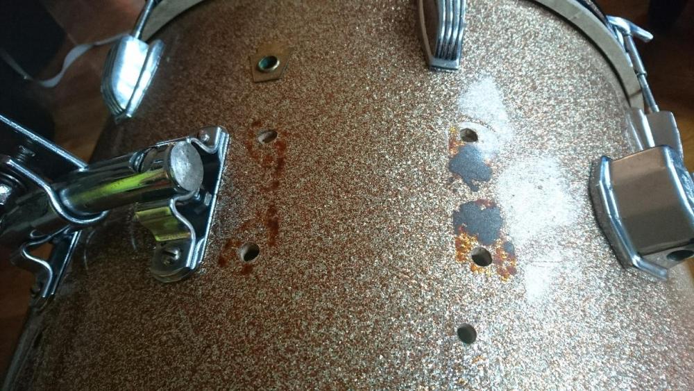 As for the rail consolette: the bass drum came with two, and both are working well. Since I only have one tom, I removed the one to the right and covered the holes with chromed plates from the consolette. These plates also cover heavy rust stains.