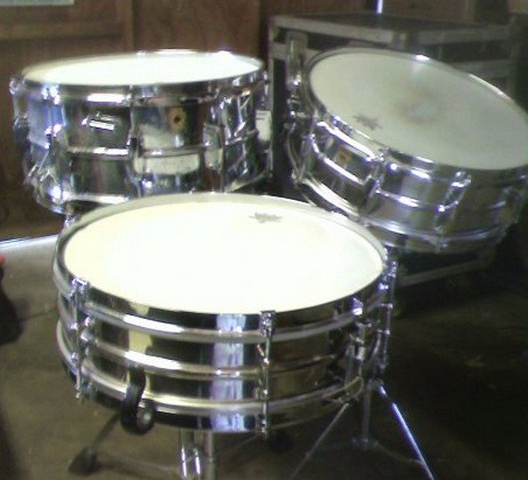 My "goto" boys...isnt it funny how drums,music,NEVER lets ya down? i mean NEVER!!! there is a song or rudiment for every emotion we feel.and most of the time it's PEOPLE who let us down...but the song is always there...never changing always breathing ur sediments righT back into ya...whatever you might be feeling....ok,ok...enought or we will aLl start crying right...I LOVE YOU MAN!!! HA HA HA HA !!! YES WELL...u might feel like tearing someone's head off soooo u bring out the big gun...6-1/2 supraphonic 402 baby!!! or playing that backbeat love song for ur best girl 5x14 never fails ya daddy....then one day ur in the mood for some "cool jazz" and ur lil ol' 4x14 does that very trick...DRUMS FOR ALL OCCASIONS,i say...4x14 two piece ludwig/NOB...5X14 LUDWIG supra 400 (pre serial) chrome over ludaloy...6-1/2x14 KEYSTONE supra 402 1967!!! LADIES AND GERMS...THE 3 STOOGES!!!! YAY!!! Jumping2 DOH Laughing H HA...IM SUCH A DORK!!!