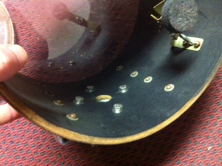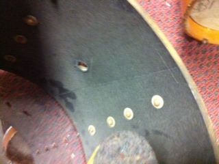 Today I got these from some very nice people for $25. Took them to the space and opened up the marching drum (I thought is was junk at first) and found the stamp. I'm thinking now that its a 1934 Ludwig in need of a resto. The hoops were odd - the reso hoop didn't have notches for the snares. (mix matched from a batch of drums?) There is one extra nail hole that is tiny Right by the strainer hardware, there are two small holes where I'm thinking a key holder was...though the tuning screws are hand tightend..(?)