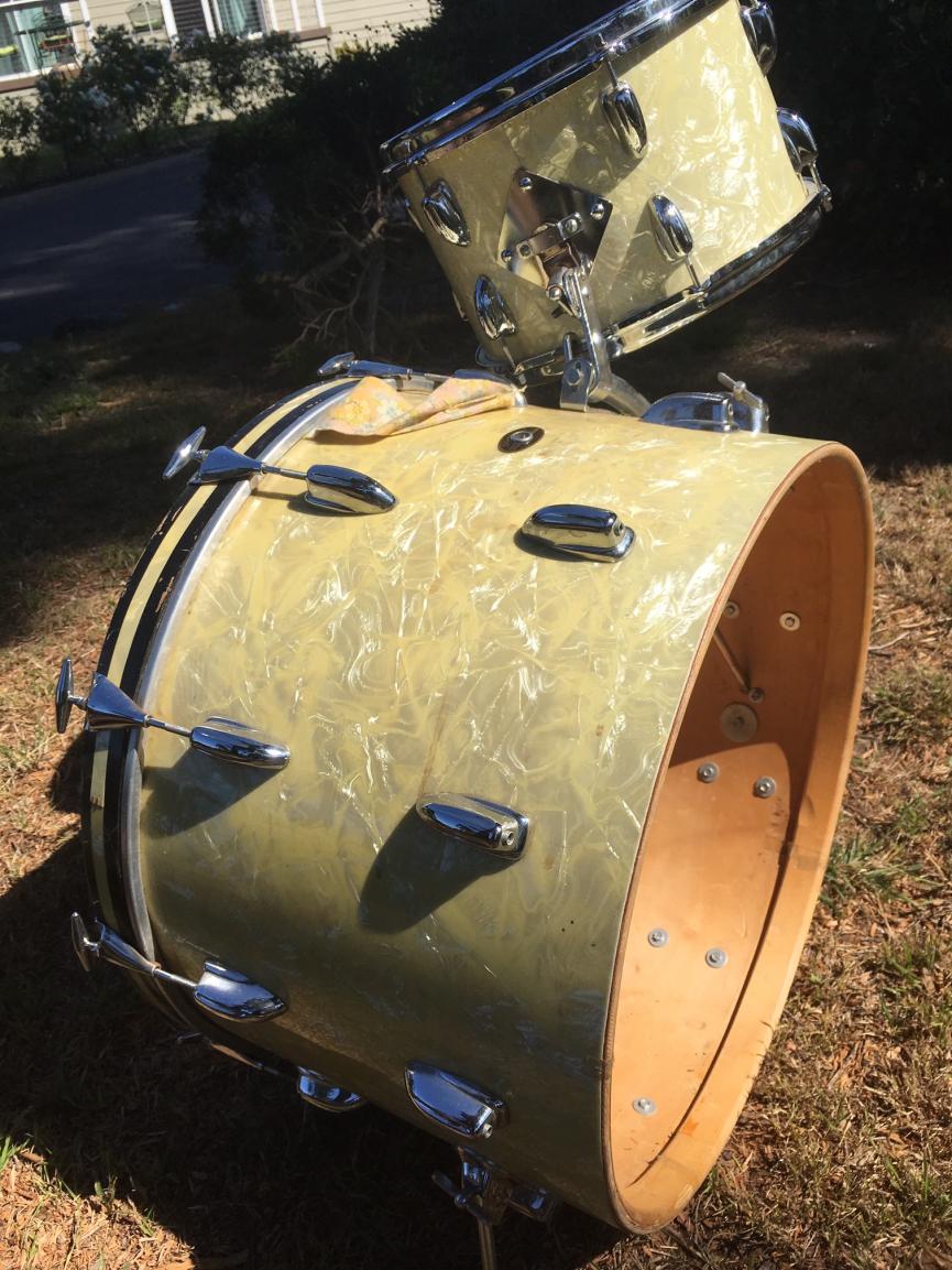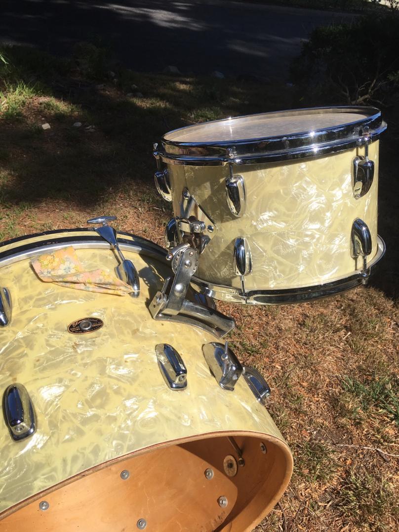 Picked up these today. Just oozing mojo. They'd been his dad's. Cruise ship drummer, etc. Chrome is immaculate. Even got an extra longrail spade with them. Slingy cymbal stand and an unknown one. Ludwig anchor. Great old canvas bags. The band logos are fun. Stamped NOV 64. If anybody's got a really yellowed floor tom, I'm in the market. Not