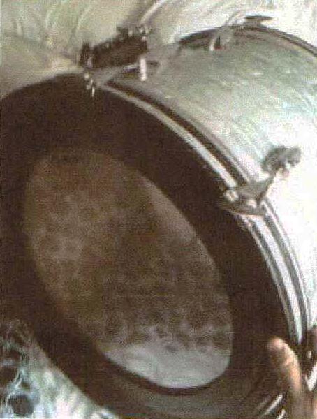 Within an hour of making my last post above this one, I was looking at auctions about to end on eBay because I have been looking for an orphan Slingerland bass drum for my next rehab project. There was a listing that had a half hour left. The description was lousy, and the pictures were sort of decent to explain things not in the listing. This time only I will share some details. The drums are listed as '60s Slingerland (12--16--20) in Midnight Blue Pearl. The crummy pictures show the bass drum and the floor tom. The 8x12 is not pictured. It looks like both hoops are on the two drums in the picture. The ad states that a Pearl mount had been placed on the bass drum. This is no big deal because I have the rewrap material for the whole set. I have patched big holes before. I also have a rail consolette to install. The ad also states that one bass drum spur had "broken off" but he has the parts. Again, no big deal to repair. The set had one bid of $200 with a half hour to go. I placed a maximum bid of $225. I won it for $206. These drums will be rehabbed in a vintage-correct fairly rare wrap. One of my favorite brands in my favorite sizes for a bottom feeder price........ Does it get much better?The original wrap had some big holes in it and a missing piece not pictured. So, I should have quite a bit of original wrap for future projects.