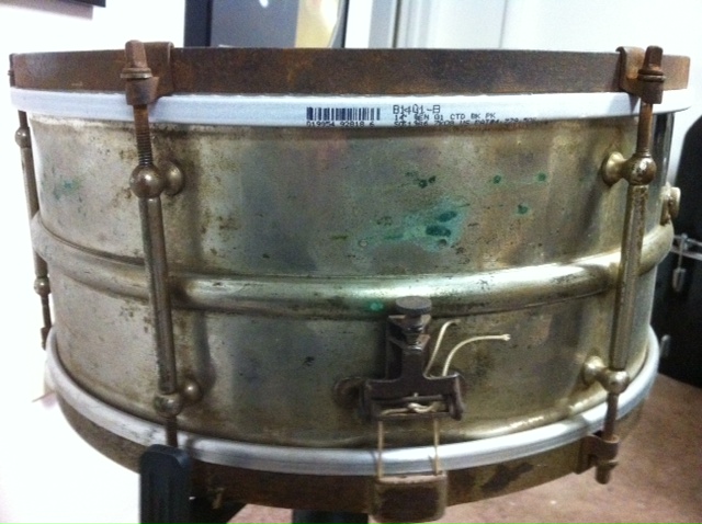 I am just curious to see if anyone else has an Ugly duckling in their collection. My contribution to this thread is my Ludwig an Ludwig 6.5x14, 2piece shell with 6 tube lugs. Original strainer and buttplate have been replaced by Leedys long ago. The hoops lost the plating at some point and are covered in surface rust. The shell has a hard green substance and a film that wont let go. This drum has a voice like an angel but it isnt pretty. I showed you mine,now lets see yours!
