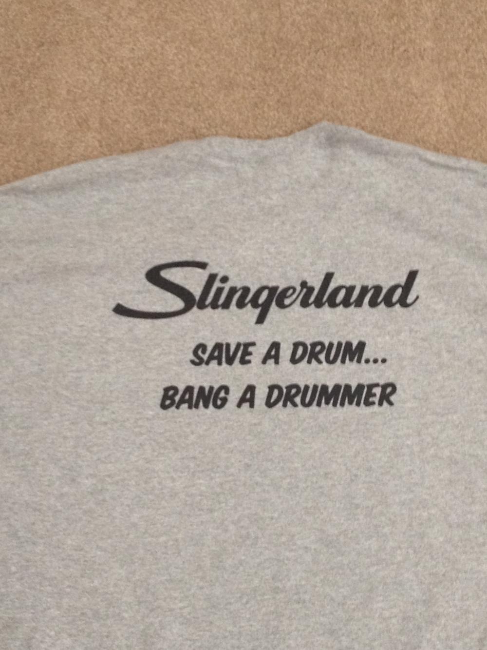 I have had a few set backs with regard to reliable (and affordable) custom tee shirt shops but I finally got the right guy, what you see here is a front view (John's art work) and the back view of my shirt. The company has the art work saved so anyone can order a shirt now. You can have whatever you want on the back (you can also reverse it if you like) some guys may want Ludwig or Rogers or whatever. The cost was $20 includes the shirt and its high quality. I dont think it would cost much to ship a shirt either. here is the info, of the company/contact/phone # and email address, he is aware that you guys may contact him, his name is Joe Fruzyna company is Squeegee Bros Custom T's