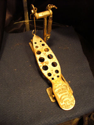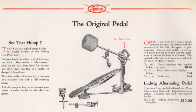 I don't have it in hand yet, but I just picked up this Ludwig pedal. Seems to me I recall a Ludwig brochure which shows this model, but I can't find it. Notice that there are two possible beater positions. Apparently, users could move the beater left or right, depending on where they wished to strike the drum head. Wondering what it may be worth to a collector and if anyone has the link to the brochure with this model shown.