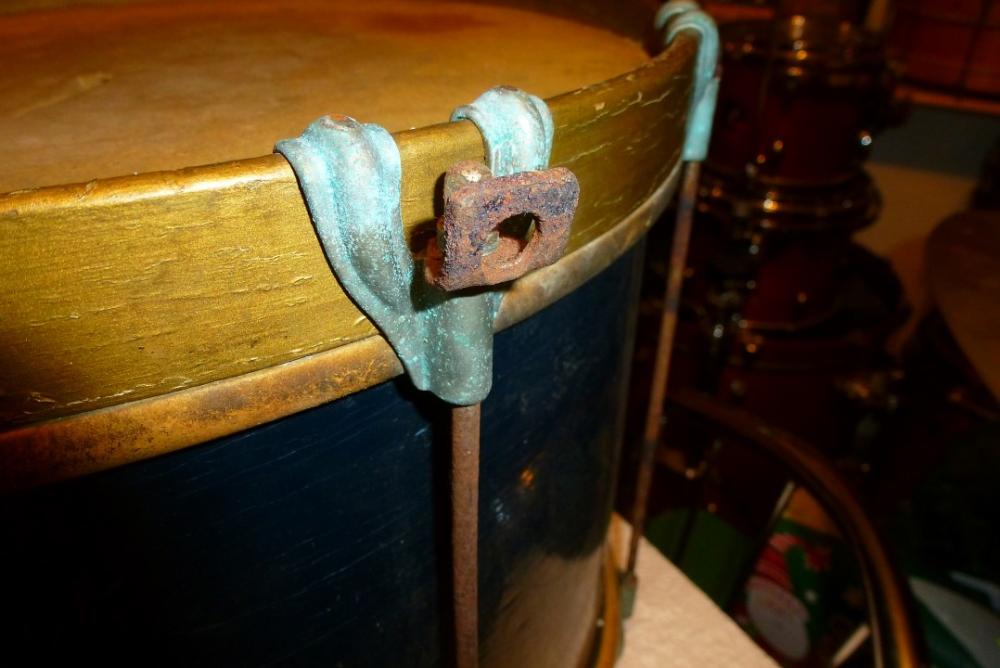 Even with the torn batter head the drum sounds not too bad. The strainer is perfectly functional the way it is. I'll clean the shell and hoops carefully and try to remove most of the rust. The drum came with a matching (blue painted stripes) pair of drum sticks.
