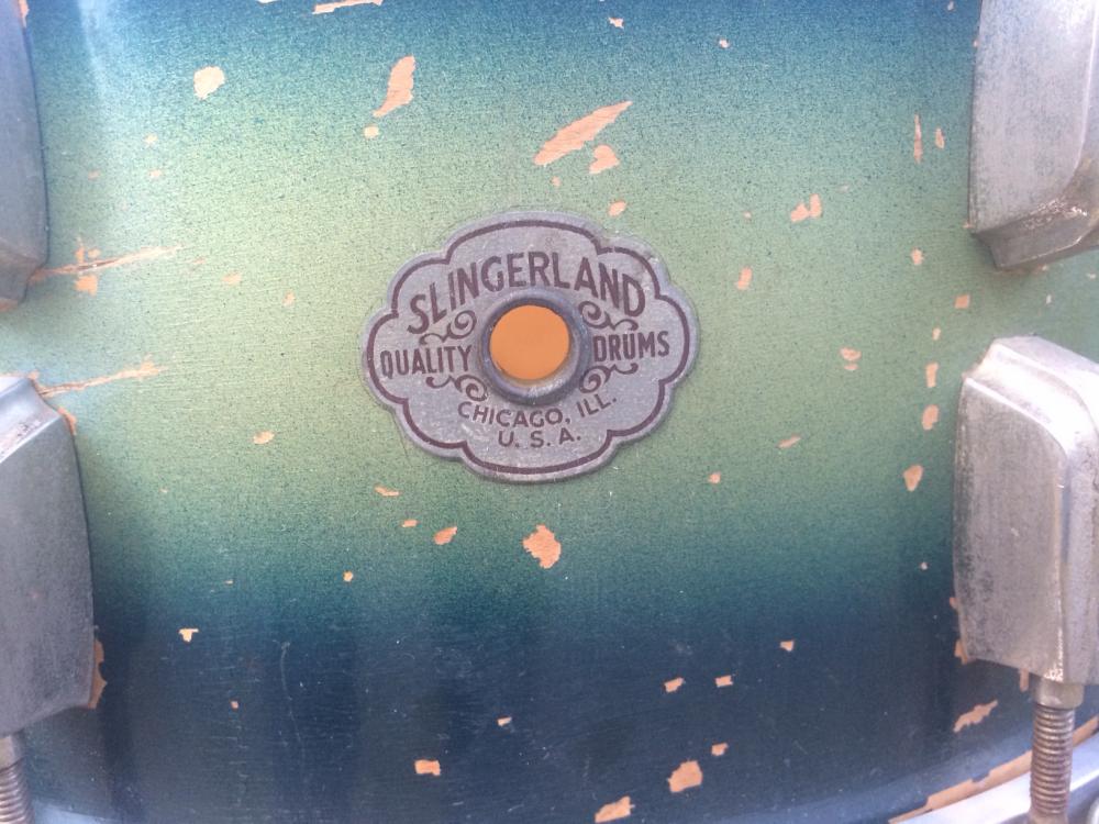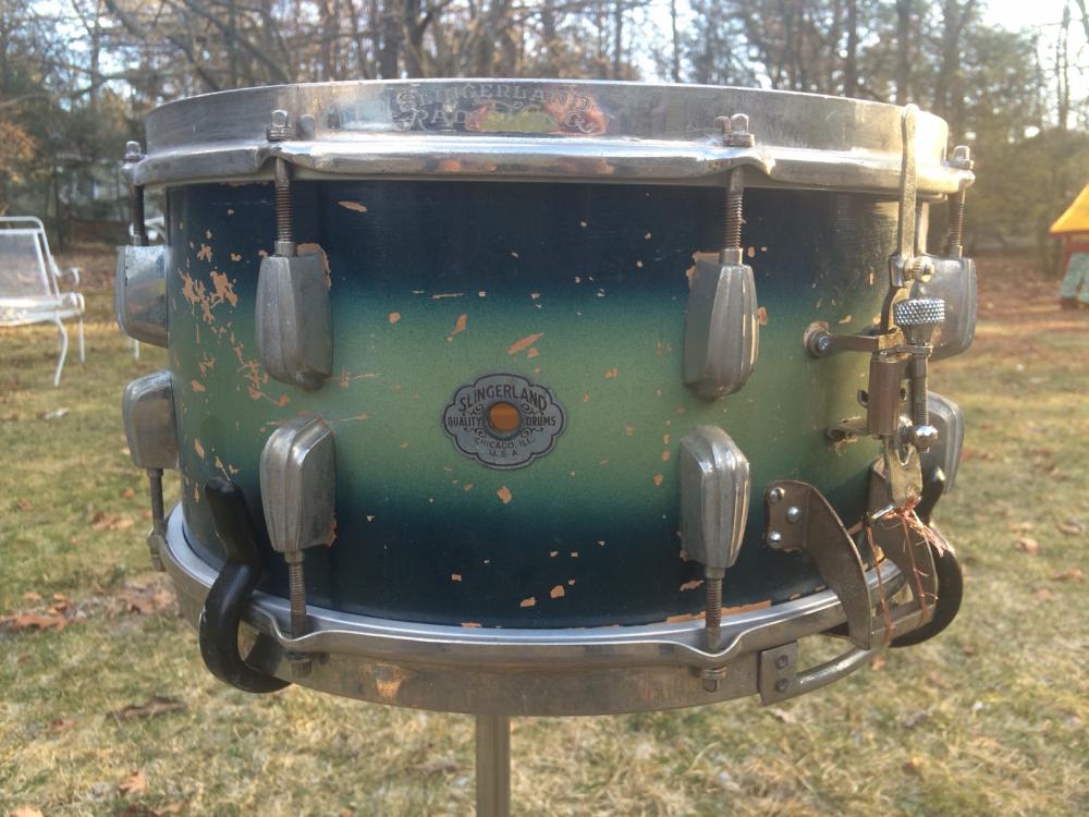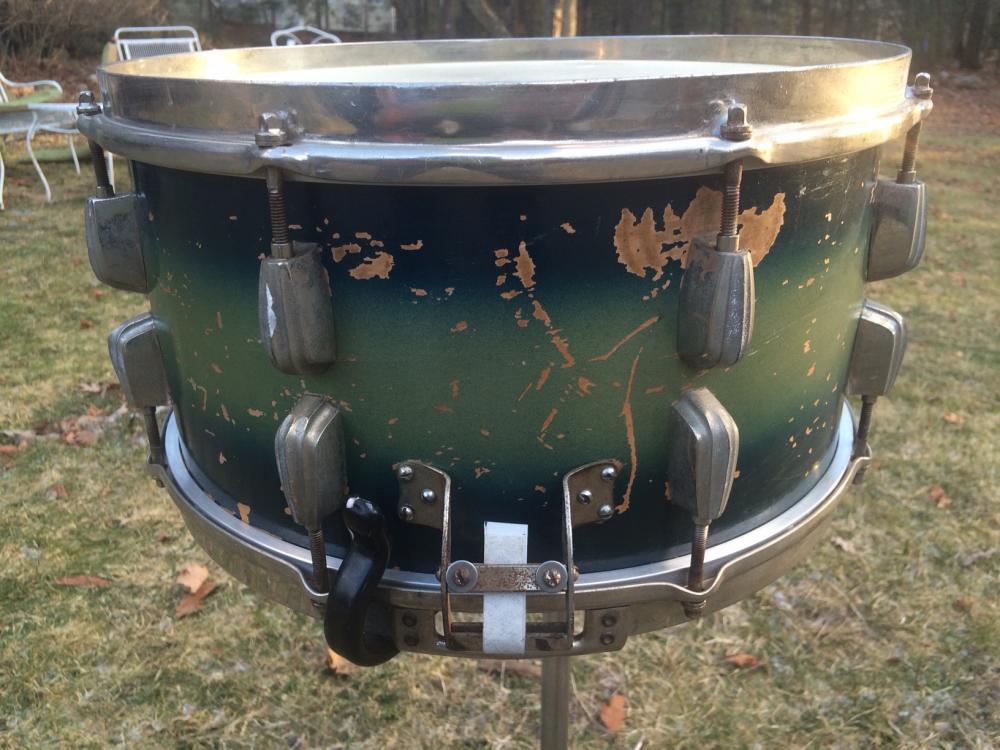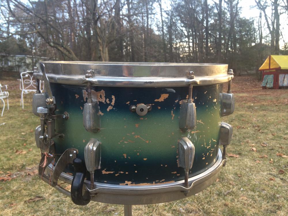 vintage 1945 Slingerland Radio King snare drum in blue/green duco finish - amazing.