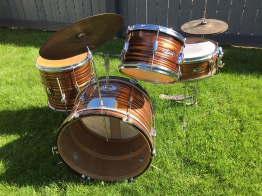 First time poster. I took about a $90 US ($125 CAN) plunge the other day and picked up what I believe are a set of mid-60s made in Japan Pearl drums in Tiger's Eye. I learned all this from reading your posts :) I know nothing about drums (I'm a guitarist) but the price was right and I was mesmerized by the wrap. The kit came complete with original Japan-stamped cymbals. The only thing missing was the front bass drum skin.