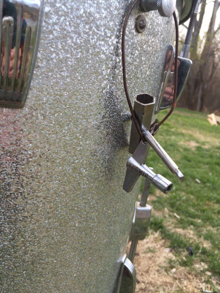 9"x13" tom / 16" x 16" floor tom / 14" x 20" bass drum in original silver sparkle, complete with matching drum key and rail key.