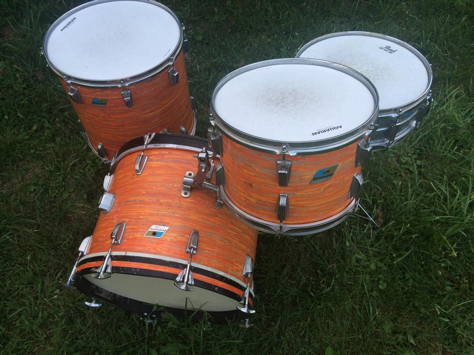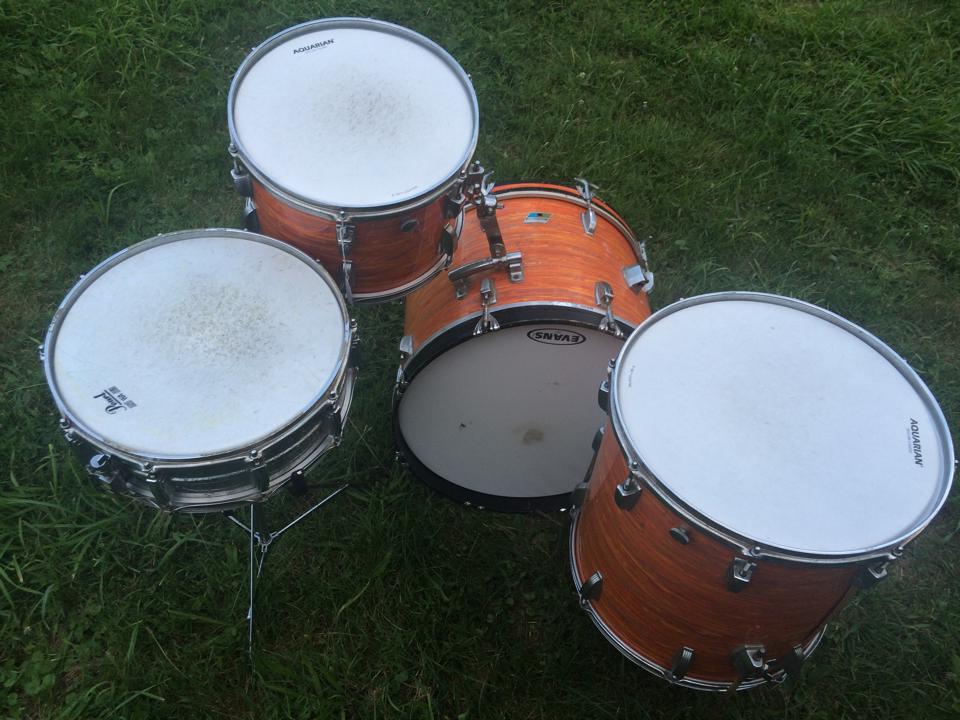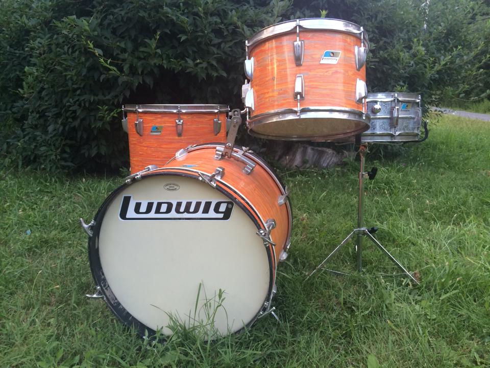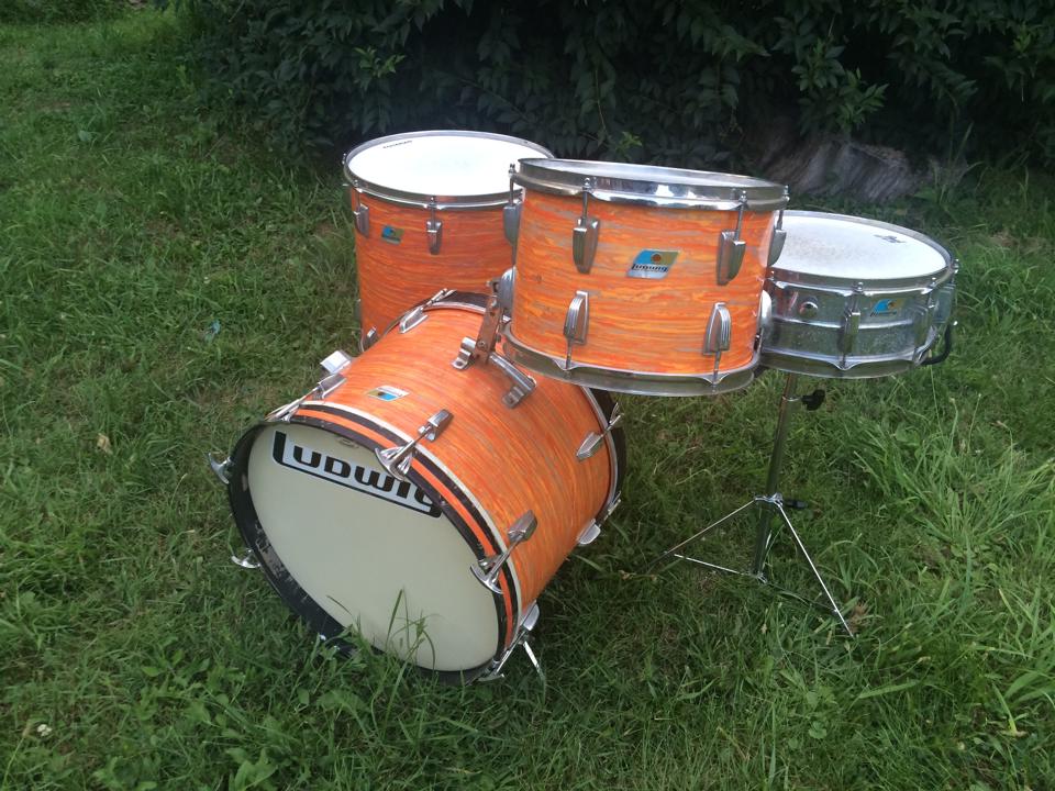 vintage 1970's Ludwig Blue + Olive badge 4 pc kit in MOD ORANGE!