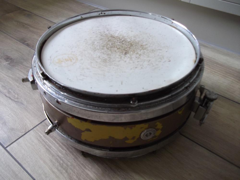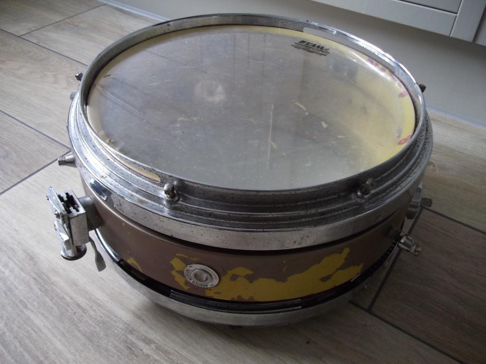 This snare drum i bought off ebay for peanuts. Complete with its original hardware. The size is 6.5" x 14". Manufactured about 75/76. It comes with original snare stand. The original colour is yellow. Has original rogers hardware. Rogers fitments were fitted to all arbiter autotunes as standard back in the day.. It was sprayed red then some golden brown glittery mess. These are the pics as i got it. At this moment in time the hoops have gone to my mates for full resto and will come back like new. Im taking charge of the shell and other fitments of which are already looking great and clean. Once its done along with the other snare im renovating then all will be revealed. Within 2 wks 2 great snare drums will be shown to you all fully restored to full 100% original spec. As you all know i restore to a very high standard......Thanks sean