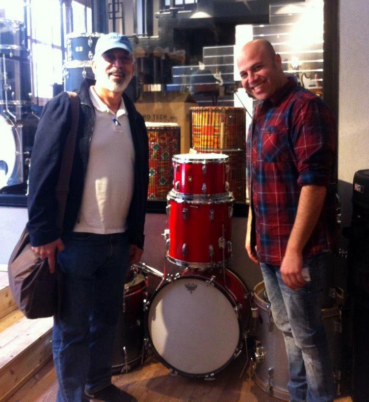 My wife and I made a quick trip across the border from Amman up to Jerusalem over the weekend. We checked in at the Little Jerusalem Hotel on Jaffa Street at Zion Square then strolled down to the Cafe' Hillel just a block or so away. We had a bite of lunch then walked up the side street, turned left and again left then headed back to Jaffa Street. Low and behold, after being in the city just a little over one hour, what do I find on my left? DRUMBITE Music Shop and School in which there were 3 vintage drums sets. The proprietor, Assaf Kraus, was very welcoming and even offered to let me use a practice room while we were in Jerusalem. Unfortunately, time didn’t allow for that, but it was nonetheless appreciated. Here are a few shots. The first of Assaf and me next to his red sparkle Downbeat set. I noted the small tom had a 345xxx serial number. Next, his Ludwig Club Date in blue sparkle (the finish was in spectacular original condition and the bass drum was a boomer). Then in the back area of the shop a mid-60’s Slingerland (Gene Krupa I would guess) in champagne sparkle. He rents them to local drummers for special gigs. A fun first few moments in the city. Who would have guessed?