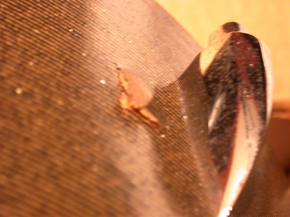 Well, during a probably violent throw of the parcel by some shipper, the foot of the snare stand impacted the iside of the very thin Beech shell and punched the outer ply right through (see pics). The outer ply's damage is about 3/4" long and 1/2" wide.