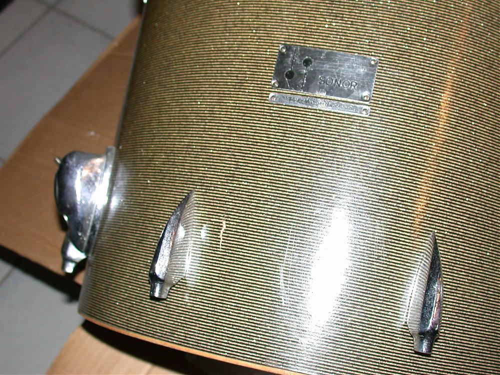 I purchased a gorgeous 1965 Sonor 3-ply Beech tear drop floor tom in the rare gold sparkle pin stripe wrap. Also in the shipment was a sonor snare stand which was placed (well wrapped) inside the shell for shipping.