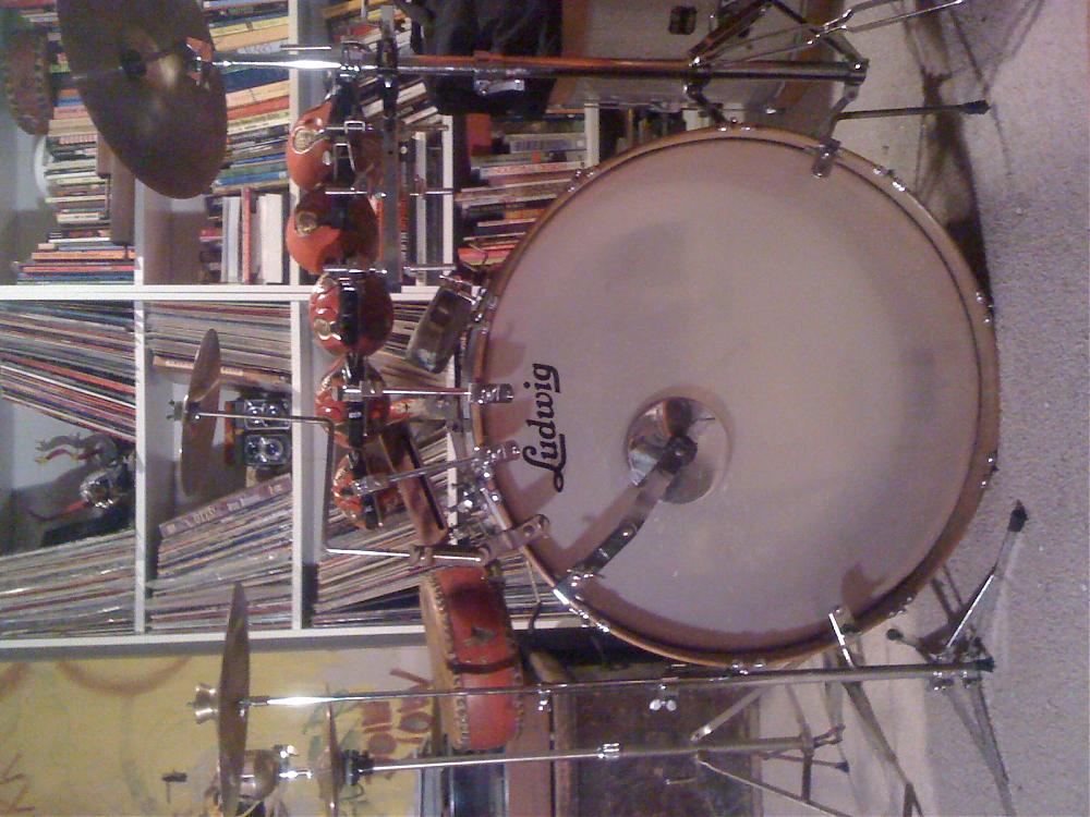 I do a weekly gig that involves amongst other things Django Reinhardt and Bob Wills numbers. I use a Walberg & Auge throne as part of the immersion process. The bass and snare are 60s Ludwig, but all of the traps are Leedy circa 1910 to 1935. When I say traps, I mean the stuff you actually make sound with, and not the metal bits holding it all in place. Here's a couple of lame pics for your scrutiny... I don't know why they alway end up sideways. Just crane your neck to the left! I'll post a more flattering one later.