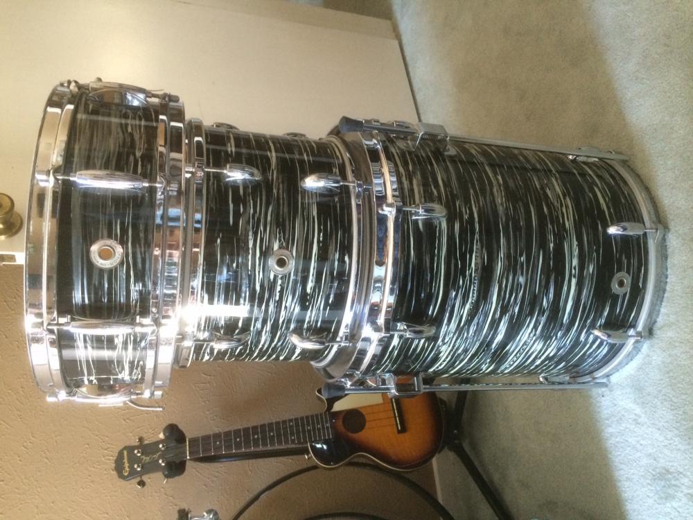 I just picked up an Oaklawn Camco set and need to make some room so something has to go. 1969 W&A set with Gretsch Jasper shells, Ludwig black oyster pearl wrap and Gretsch hardware. Sizes are (depth x diameter) 8x12, 15x14, 14x20, 5x14.
