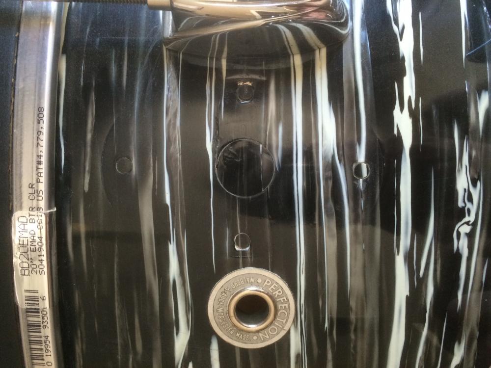 Extra holes in bass drum only. Toms and snare have original mufflers. Wrap is very vibrant and hardly (if at all) faded. Heads are snug on 12 but fit the other drums nicely.