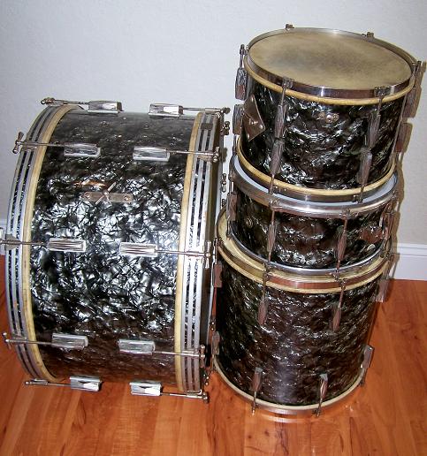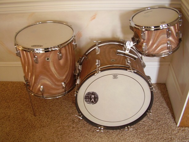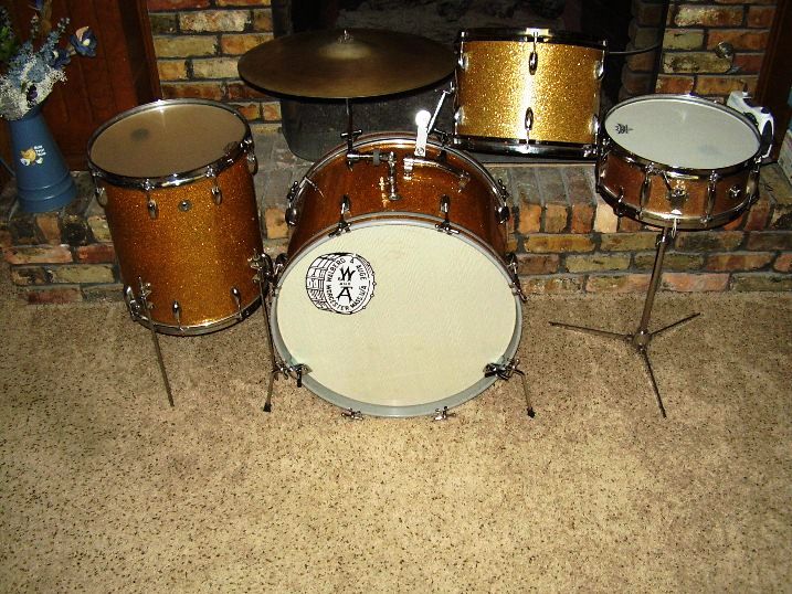 That is a killer drum set. Wish it were mine. I have three W&A drum sets that are each unique, and all quite gig worthy. Your Black Diamond Pearl set is older than mine which are from 1963, 1965, 1972. You all are correct about the Gretsch, Rogers, and Ludwig components mixed in with W&A's own metal and mechanical parts such as the pedals, tom holders, and internal mufflers. There was ONLY one man who assembled the drums who hand signed his RGB initials and the date inside the shells. He did this on all of the unpainted shells and silver painted shells that I have seen. I am not certain about the black painted shells that pre date all of my W&A drums. There is precious little published information available about the Walberg and Auge company. I think that they might have been the originator of today's current batch of "custom drum assemblers or Keller assemblers". W&A was well established as a major manufacturer of drum hardware for virtually all American drum brands. They traded out hardware and services to obtain shells, hoops, wrap, and other items from primarily Gretsch, Rogers, and Ludwig. The blue set has more conventional tension rods while the other drums all have the hex head rods. I also have a W&A hex head drum key. There must have also been legal agreements for W&A to use the proprietary parts from those other drum makers. Thanks for giving me another opportunity to show off my W&S babies.