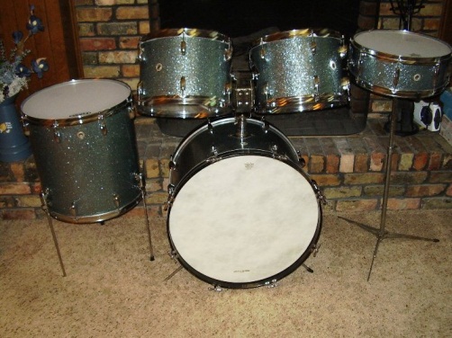 1972 Mostly Gretsch unique Glass Glitter wrap that I call Ice Blue Metallic 14x22, two 9x13, 16x16, matching wood eight lug snare similar to Gretsch