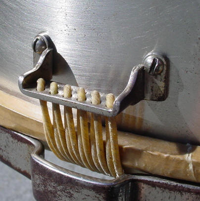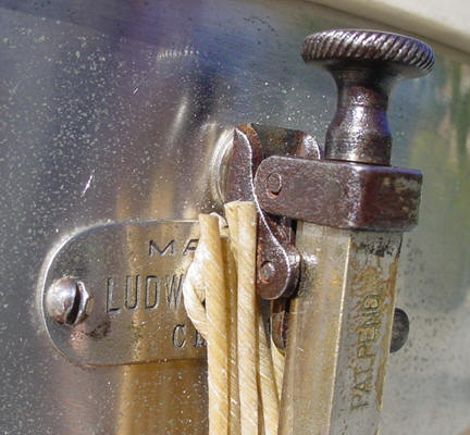 This drum has the "dog tag" version of the Ludwig & Ludwig badge. The badge is right below the flip-down strainer.