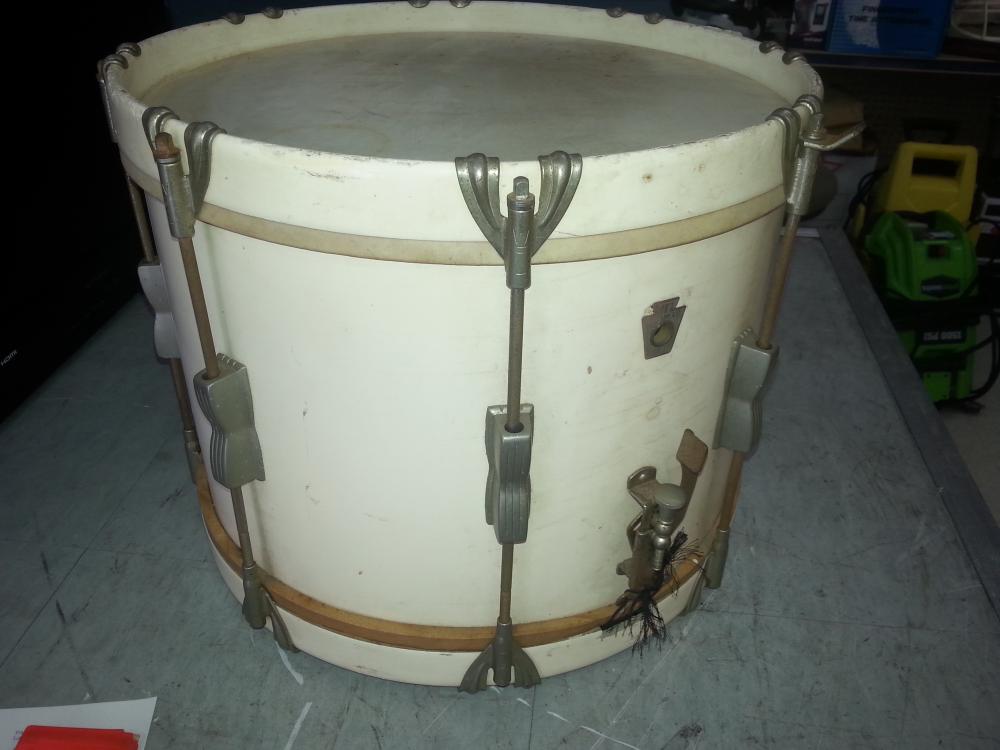 Hoops are wooden, heads are original, in fact everything seems to be original on it. I did find a reference to the badges era which stated 1940's. 8 lug as well. All marked WFL.