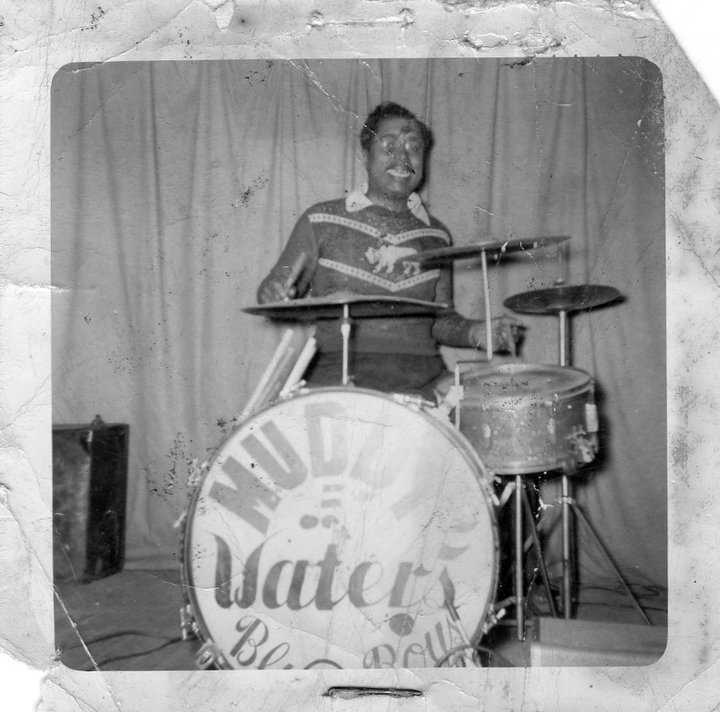 This is the original drummer in the Muddy Waters band, Elga Edmonds (a/k/a Elgin Evans) c. early '50s. Is that a '40s Ludwig snare? Anyone want to take a guess at the bass drum? Whatever it is, it's a big 'un.