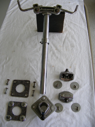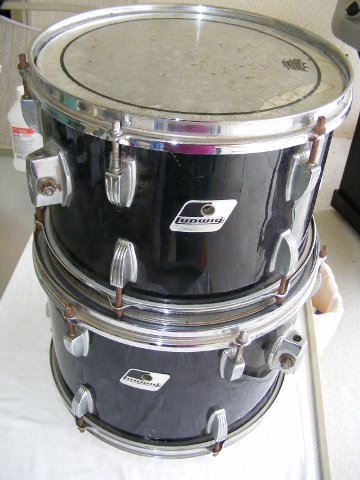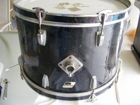 Went on a field trip today and came back with what appears to be a not so beautiful Ludwig Rocker Set. The badges are Black & White with rounded points, NO SERIAL NUMBERS. The insides are painted kinda brown speckled. The black wrap is CRAP but the shells themselves are round with nice bearing edges...hardware looks sorta pitted but I cleaned up one lug and it shines up with an "orange peel" finish to it...not smooth like brand new chrome pieces...but I think acceptable if I was going to put them back together again. I doubt that I will, but I was just interested in what age these might be. Take a look, if you would, and tell me if it was a wasted field trip. Oh, Yeah, the best part is they smell like a combination of cigarette smoke and cat pee!!!Laughing H