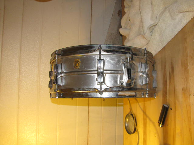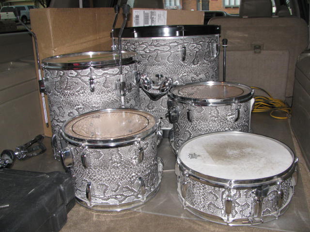 I recently bought a tama rockstar 5 piece kit off of craigslist for $100. they have been wraped in python wrap. I watched these on cl for a few months and deicded to go see them and they looked way cooler than his pics so I bought them. A friend of mine has a band "Reverand Al & The Pythons" I recently hired Al to work at my upholstery shop. I brought the drum back to work and showed them to him. He litterally flipped out! He had to have these for his band. I gave them to him for free with the stipulation, if he ever wants to get rid of them I get them back. About a week ago he brought me this old snare drum he had in his storage and gave it to me. Well its a 1969 shiney silver acrolite in excellent shaped behind the dust and dirt. it shined up really well. Last night he brought me a vintage slingy kick pedal also in excellent shape. Next he gave me a brand new in the package 1" knob ludwig muffler. he also gave me a shot to hell tom shell with scratched up large classic lugs skyblue pearl. Im very happy to recieve these delictable items.