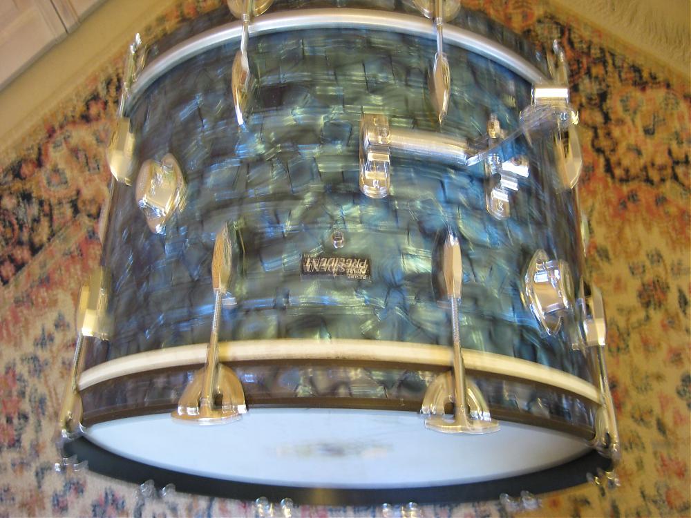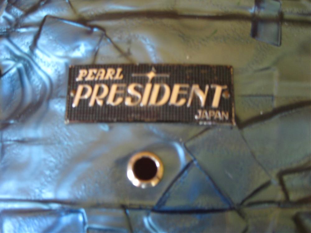 I've got this Pearl President 22" bass drum. Looking at the catalogs it looks like a '68 Super Deluxe with the consolette rail tom mount, but the '68 catalog shows gold script badges, and no Presidents in the catalog.