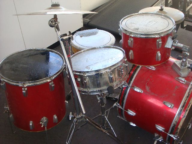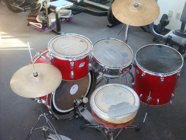 The snare is obviously a later "Rocker", but the three red drums have rounded corner B/O badges. Do you guys think these are the 4 ply "Select North American Hardwood" shells or the earlier 6 ply/no ring shells?