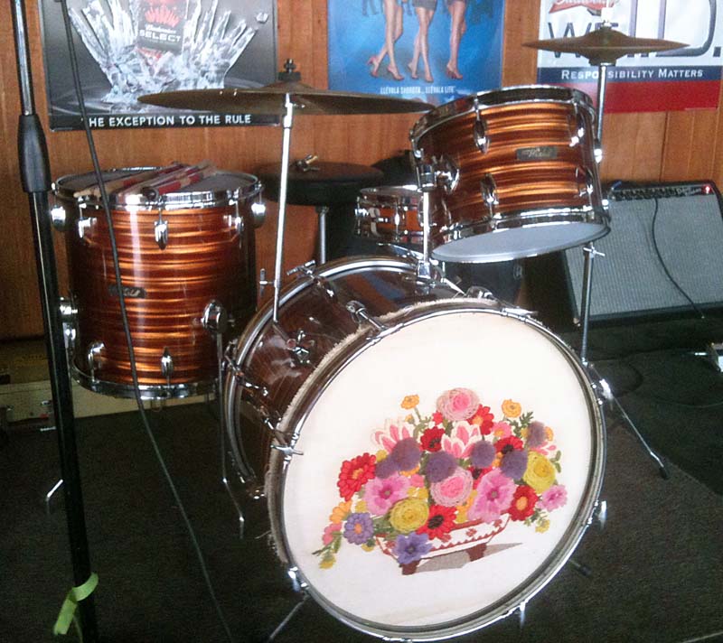 I love this kit and have used it for rock and funk gigs as well as coffee-house acoustic sets. The wrap's in great shape and the hardware's shiny with no pitting or rust. I'm missing a hoop but at least have an original one for the reso side. Speaking of the reso side, that's what gets the most comments on this kit. That bit of decoration began life as a framed bit of embroidery. My wife hated it and wouldn't let me hang it on the wall at home. One day I was looking at it and thought, "you know, that's about the same size as the kick drum ..."