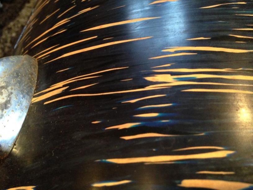 Side by side of the snare and the 13" tom that I've already stipped and started wet sanding. I don't know how much more I should sand on it. It's a lot better that it was. Before pics are at work. The white was dull brown!! I circled where I was working the wrap, but you can see the difference between the snare and how vibrant it is (I haven't cleaned it up yet) and the tom. More to come