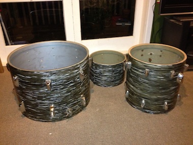 - Shell sizes: 20x14" bass, 12x8" rack tom, 14x14" floor tom. No original snare. Khaki-green pearl lacquered finish.
