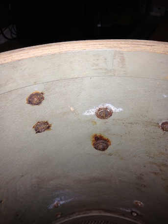 The annoying thing is that some of the machine screws broke off when I removed the lugs from the shell. Perhaps I was too hasty taking them off; should've thought before I did it, etc. For this reason, I haven't started doing the same on the 14" floor tom, which is in worse condition.