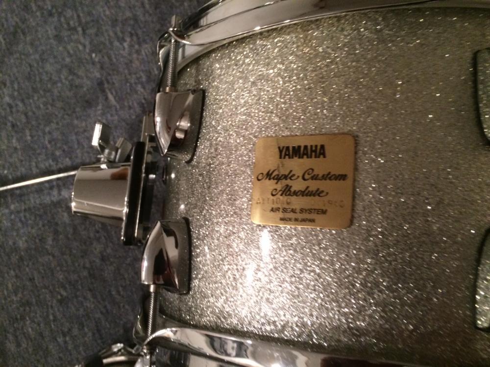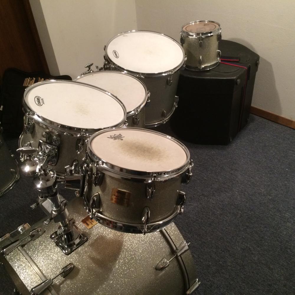 Early Maple Custom Absolute series drums (Gold Badge) in Silver Sparkle lacquer finish. Sizes: 6.5x10, 7.5x12, 12x14, 14x16 and 16x22. Included in the sale is an 8x8 stage custom tom that was wrapped to match. The 10" and 12" rack toms were professionally cut down and have double 45 degree bearing edges. The kit has some light wear, some cosmetic issues with the badges on the 10" and 12" (when I glued the badges back on, I took some bad advice and they're a little sloppy. From a couple feet away, it's not noticeable. Check the pictures), otherwise it's in great shape. Bags included for 12x14 and 14x16. Sale includes bass drum tom mount and double tom stand.