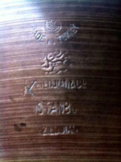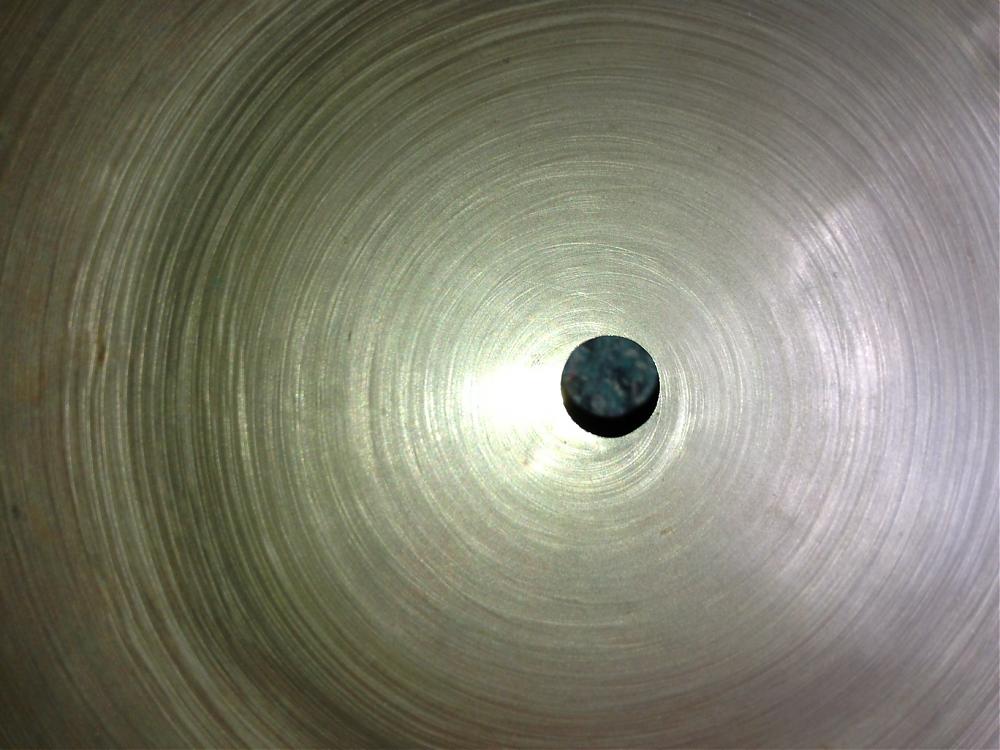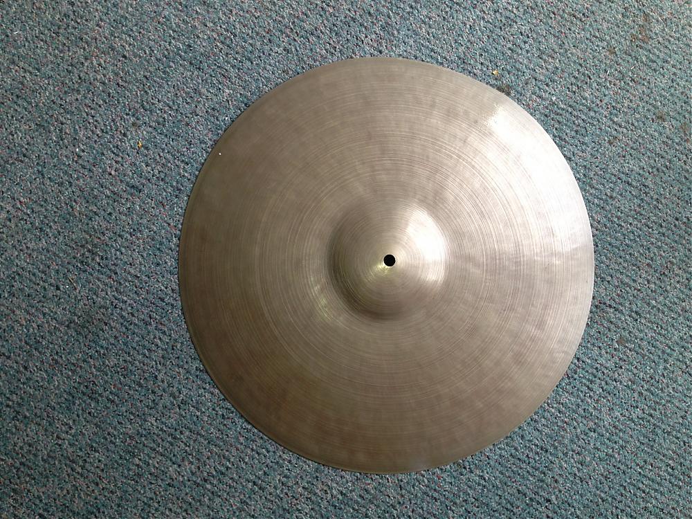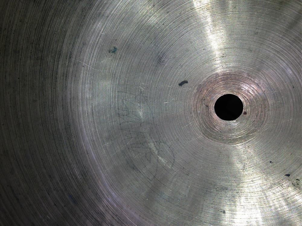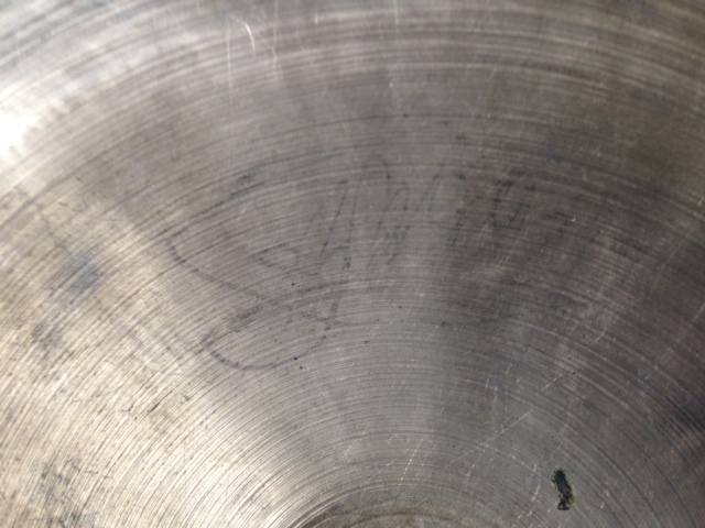 Hi to all. Since my one and only post, I have been gaining knowledge from many informative previous posts. I think I have got enough information for the great cymbal detectives and historians. Cymbal in question of age and value is an 18 inch wafer thin crash, coming in at 995 grams. It seems very light weight compared to past found information. I also have included a photo of either a faint signature or just a bizarre scratch formation on the under side of the bell. I hope you find it interesting. Many thanks.[Attachment: 62962]